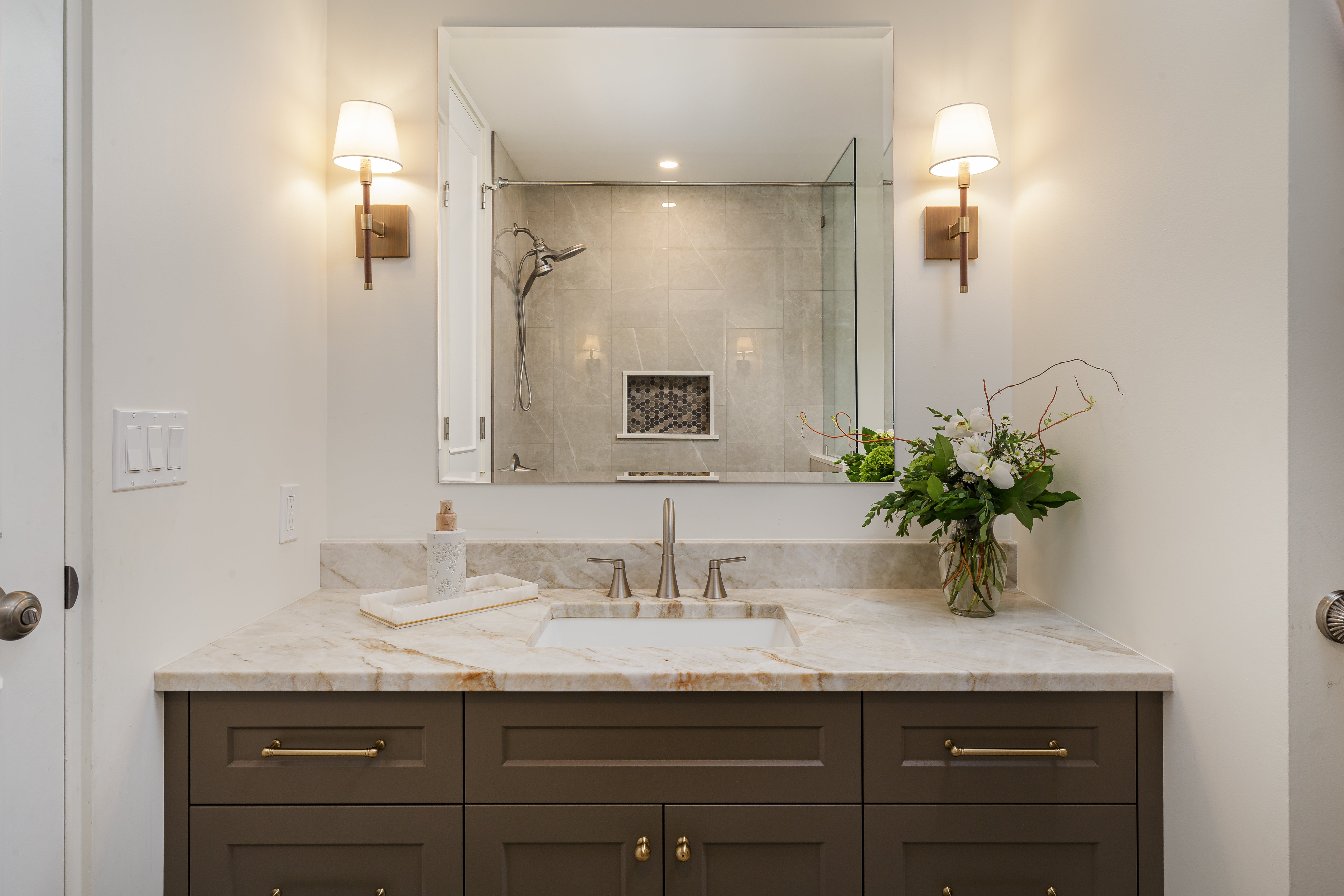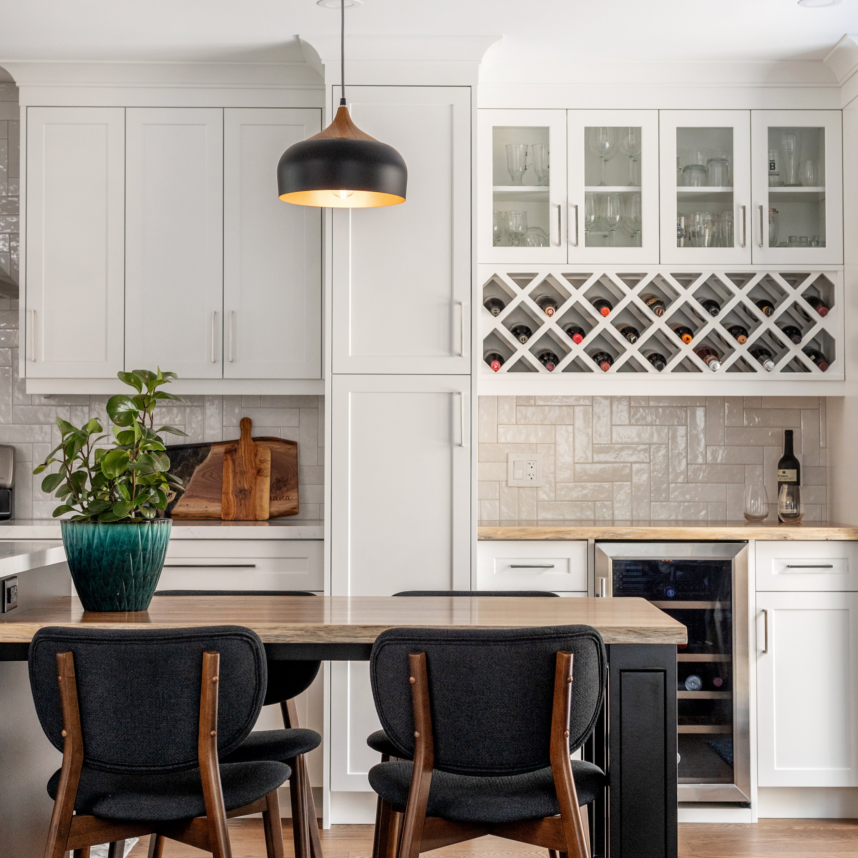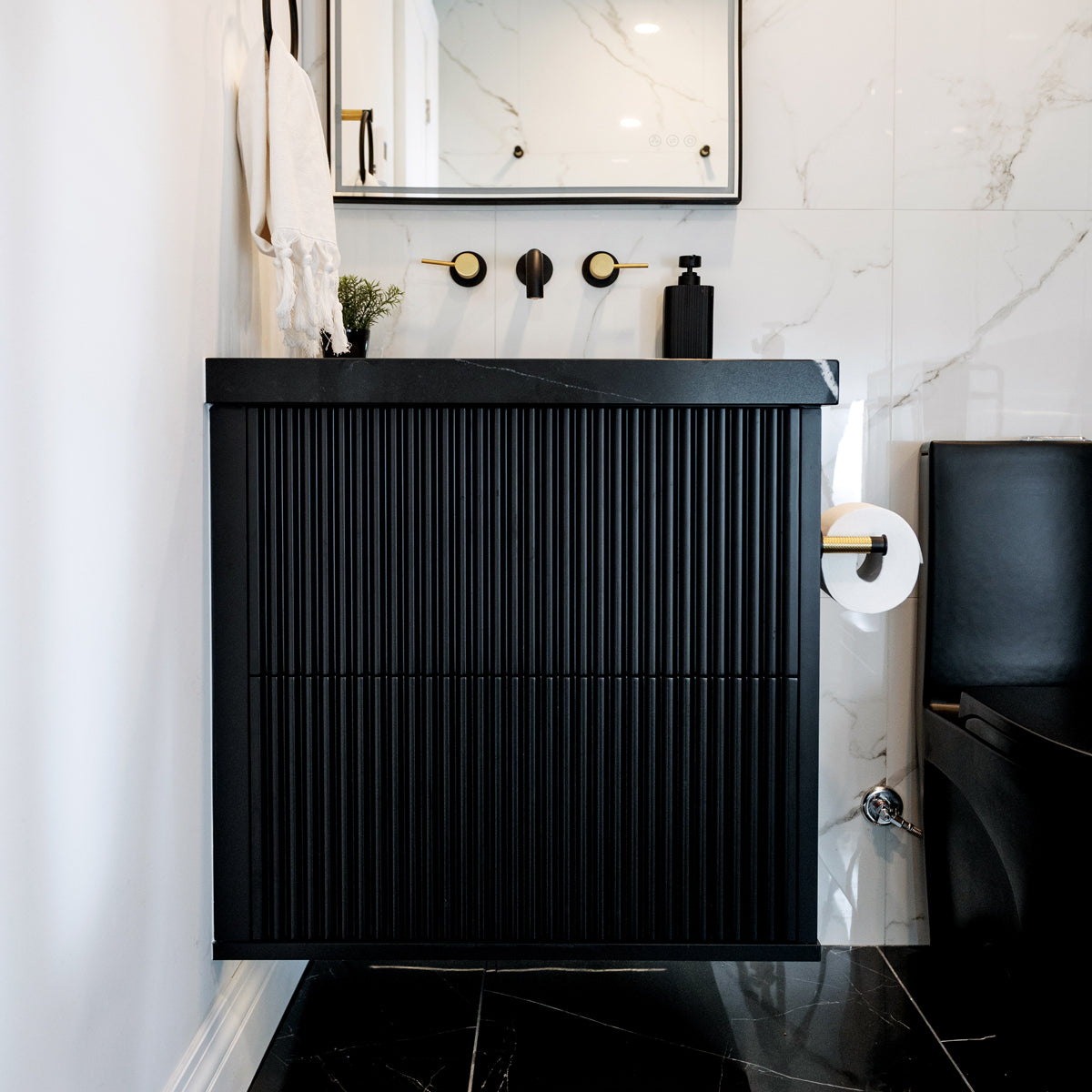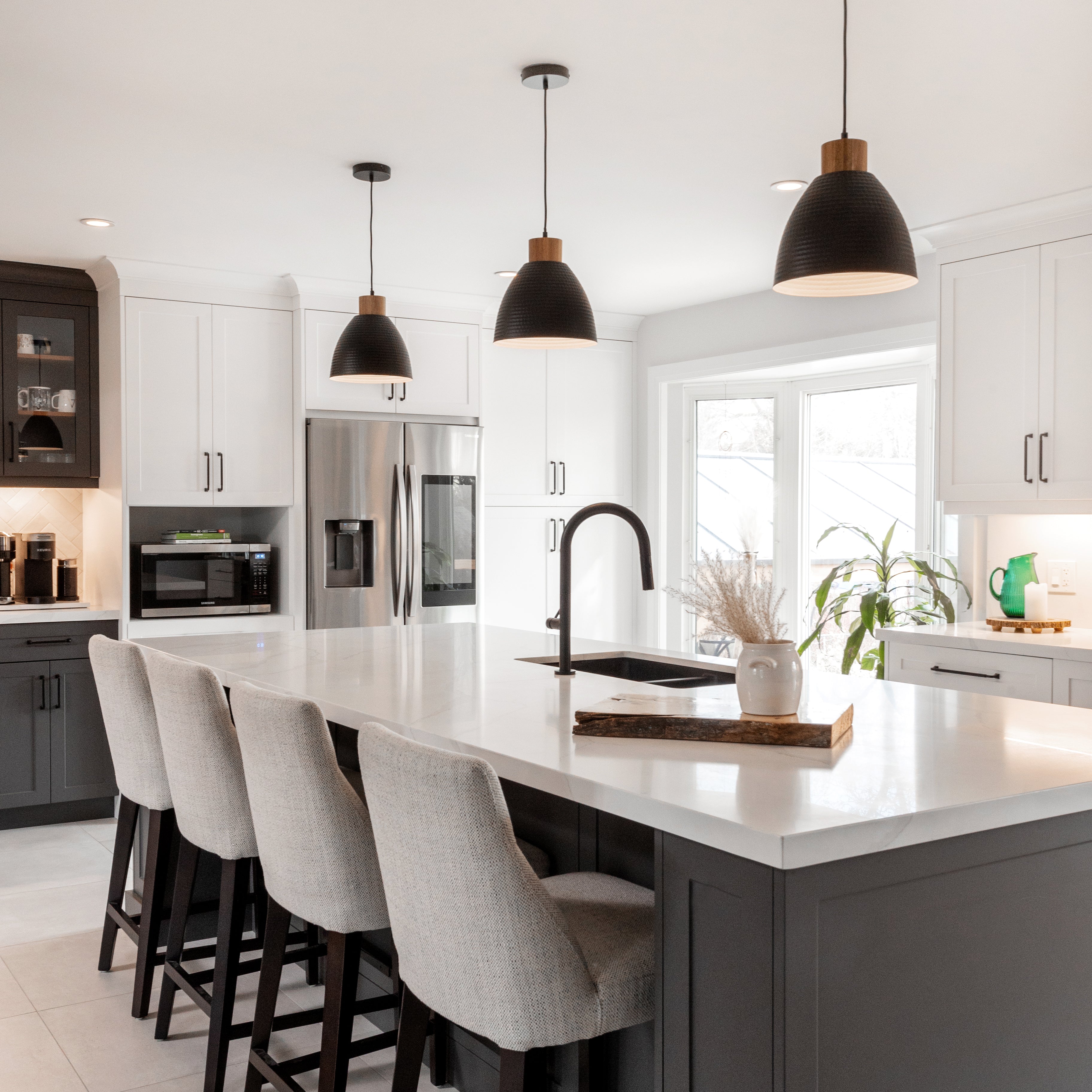 Sleek lines, detailed fixtures and a striking contrast for a dramatic ambiance.