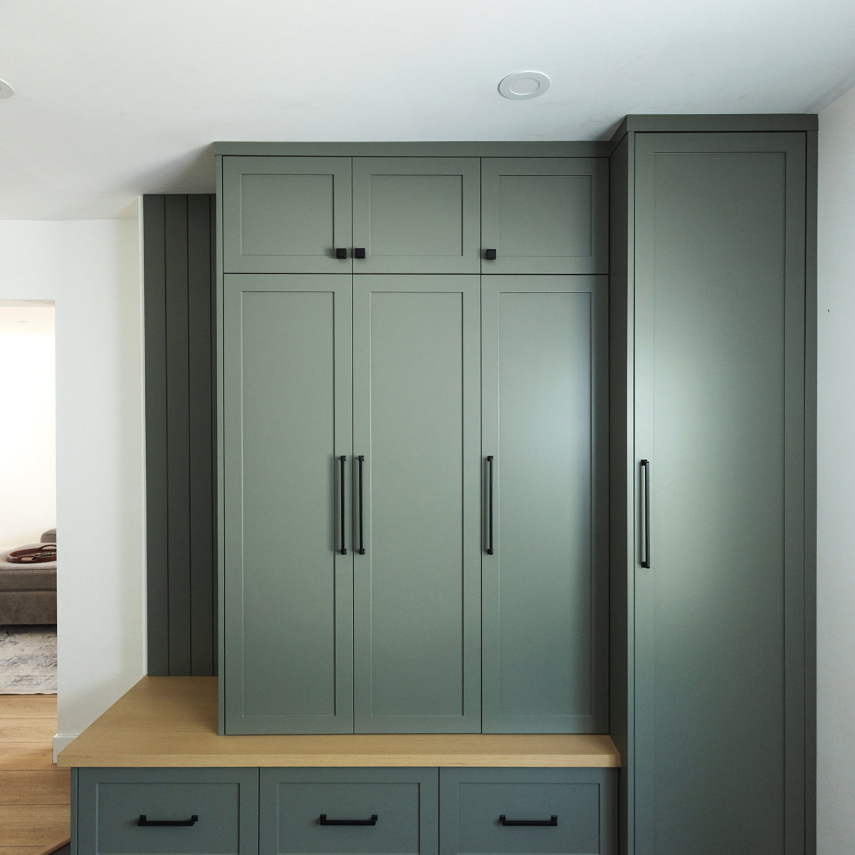 Soft sage green cabinetry with tailored storage solutions lends a modern elegance to this thoughtfully designed mudroom.