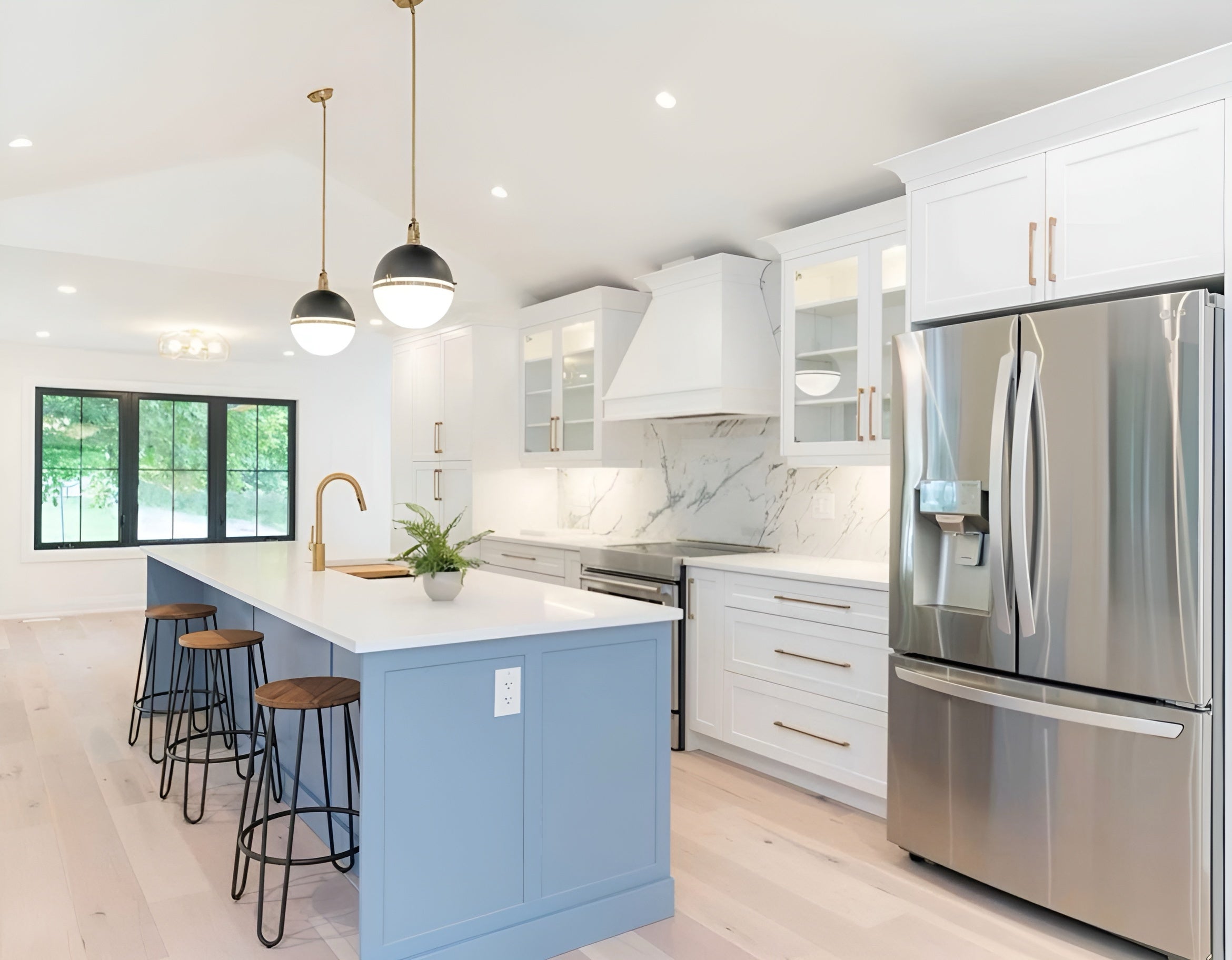 Indulge in the opulence of a kitchen adorned with replicated marble, blues and golds.