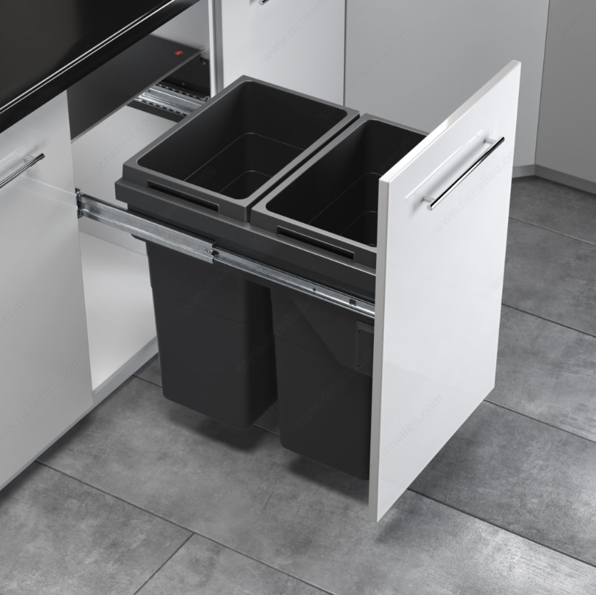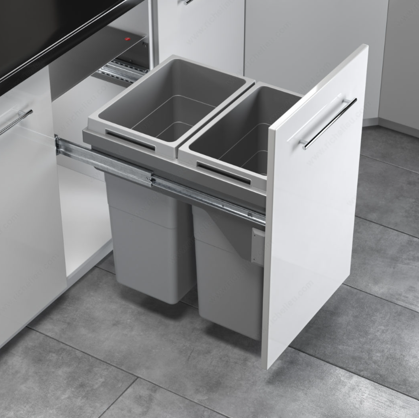 Make your life easier with the Euro-Cargo II pull-out recycling systems. Over-travel slides, giving you full access to your bins. The metal lid remains fixed inside the cabinet. Once the recycling system is closed, the lid covers the bins, preventing the spread of odors. With Slow motion.